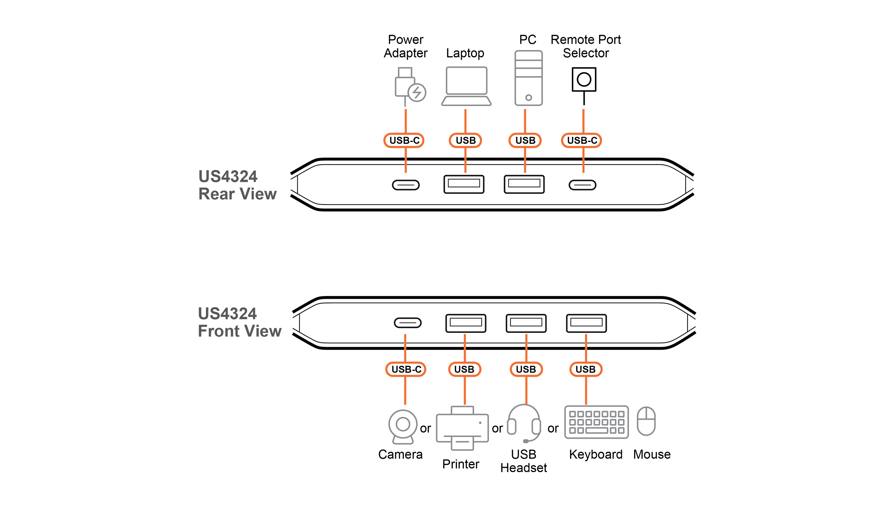 Do przełącznika US4324 można podłączyć do czterech urządzeń USB, takich jak klawiatura, mysz, drukarka, dysk zewnętrzny czy kamera internetowa. Wszystkie podłączone akcesoria można szybko przełączać między dwoma komputerami.