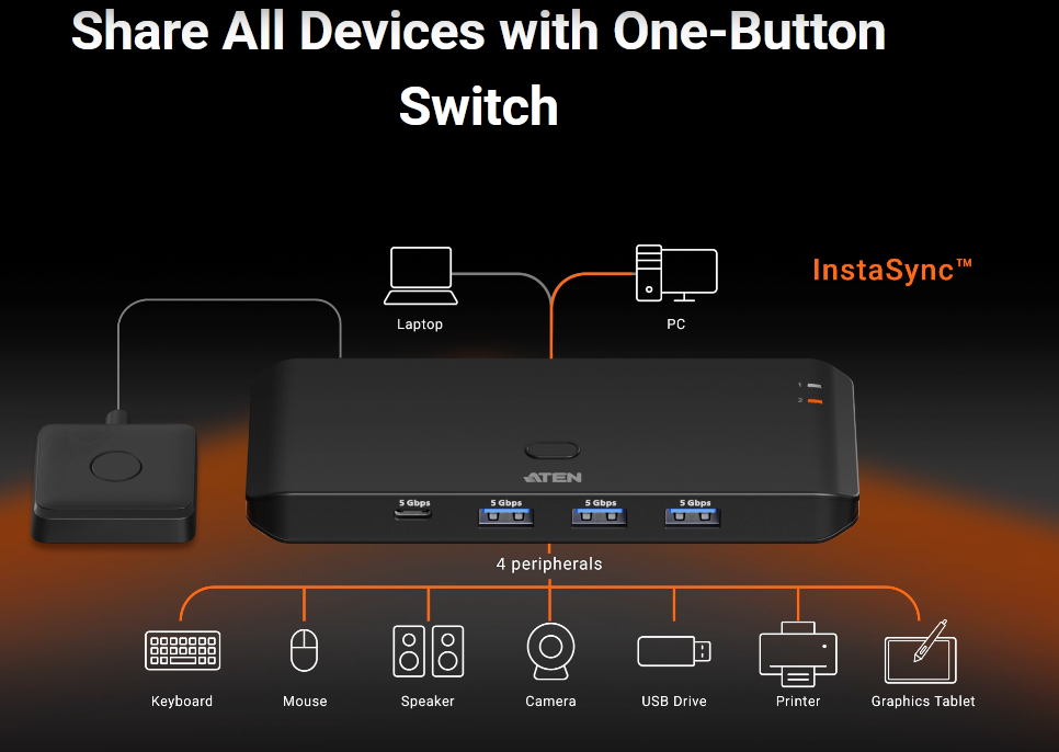 Urządzenie wykorzystuje technologię InstaSync™, która pozwala natychmiast przełączyć kontrolę urządzeń USB między dwoma komputerami. Dzięki temu można szybko zmienić aktywny komputer bez przerywania pracy.