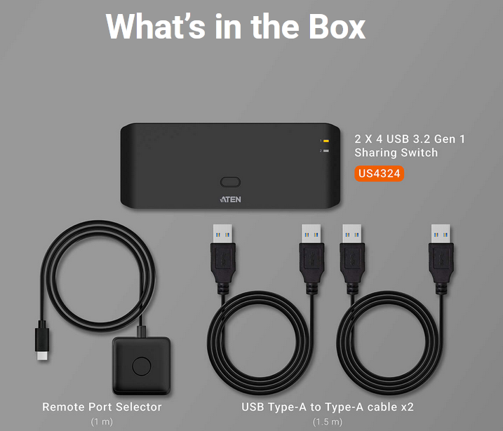 ATEN US4324 to 2-portowy przełącznik współdzielenia USB 3.2 Gen 1, który umożliwia korzystanie z jednego zestawu urządzeń peryferyjnych (np. klawiatury, myszy lub pamięci USB) na dwóch komputerach jednocześnie. Dzięki temu nie trzeba przepinać kabli między urządzeniami.