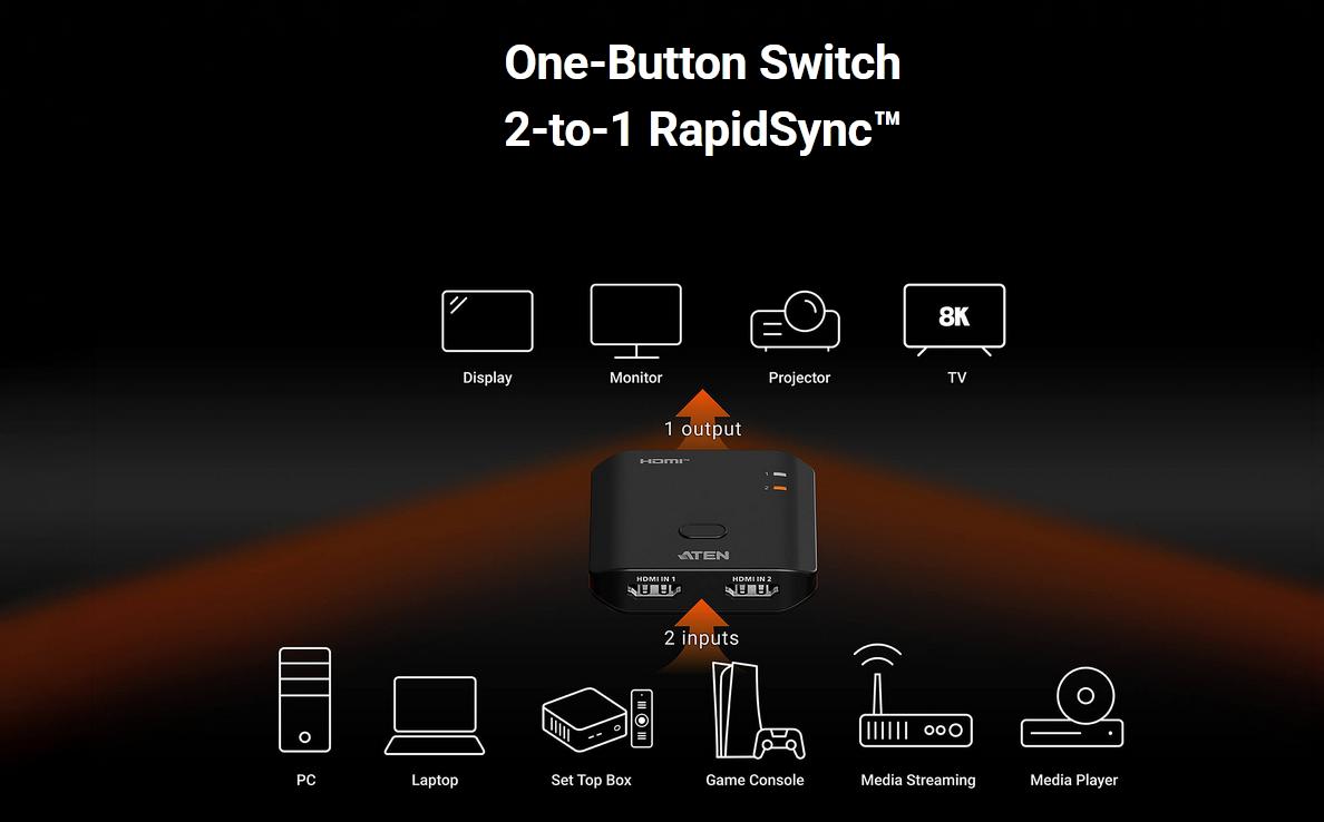 Dzięki technologii RapidSync™ możesz błyskawicznie przełączać sygnał audio-wideo między dwoma źródłami obrazu na jednym wyświetlaczu. Wystarczy jedno naciśnięcie przycisku, aby zanurzyć się w wizualnej uczcie pełnej niezwykle ostrej szczegółowości, żywych kolorów i kinowego dźwięku — bez komplikacji, bez dodatkowych kosztów, tylko czysta satysfakcja.