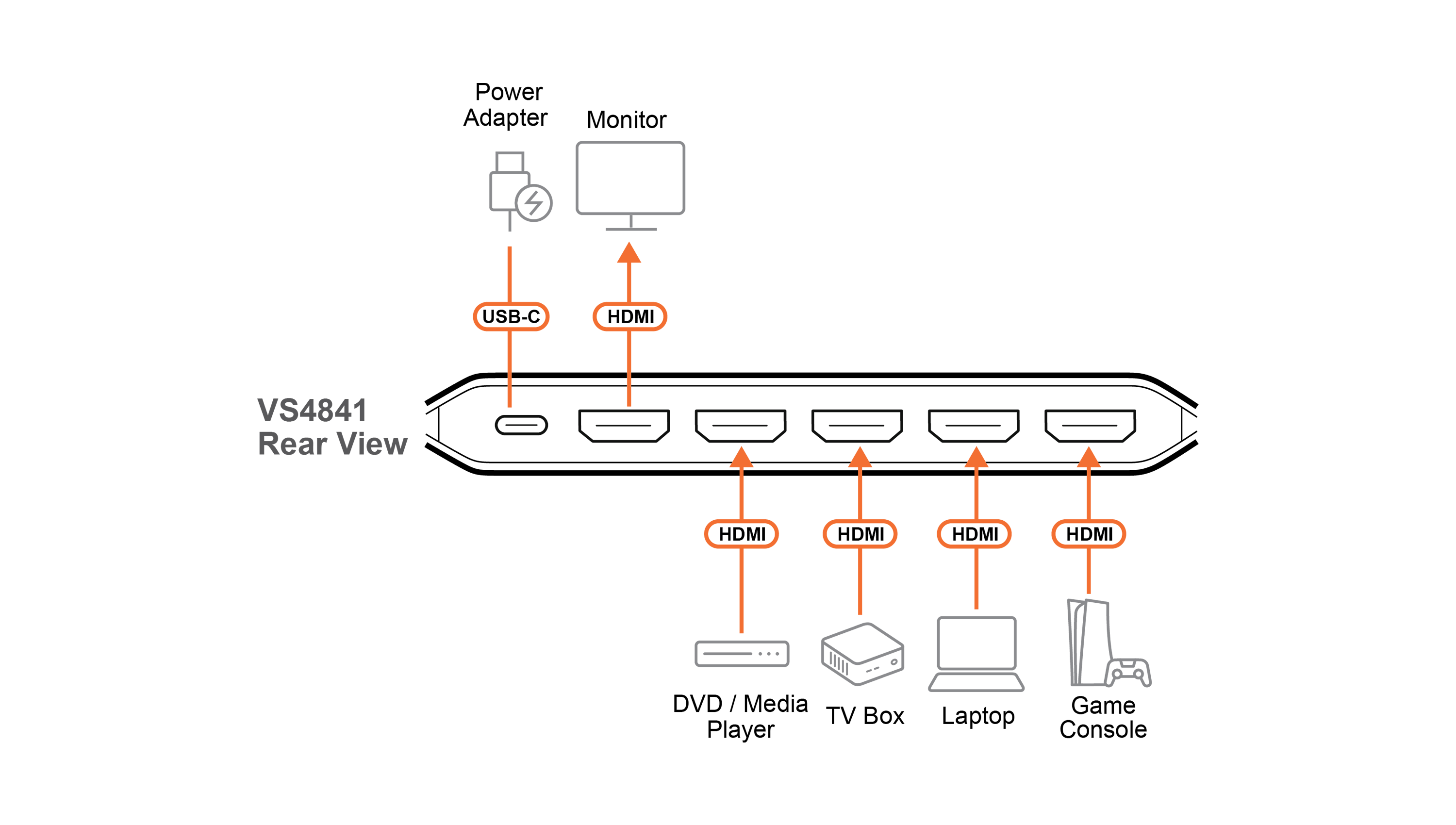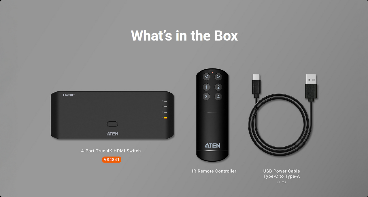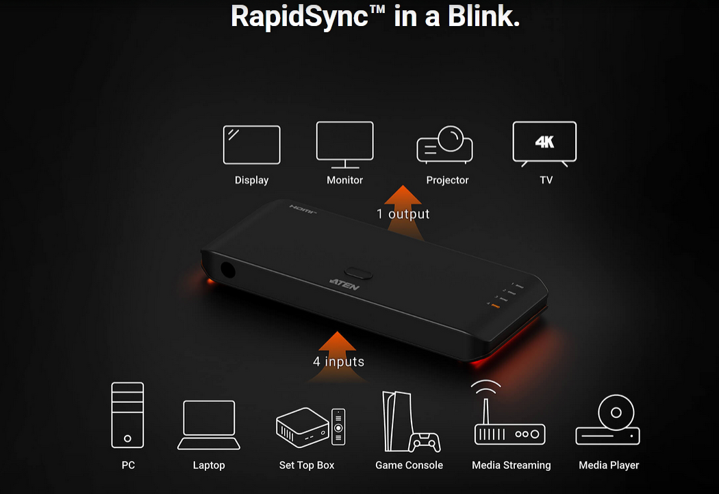 Model ATEN VS4841 pozwala podłączyć do 4 urządzeń HDMI jednocześnie, takich jak komputer, konsola do gier, dekoder telewizyjny czy odtwarzacz multimedialny. Następnie wybiera się aktywne źródło sygnału jednym przyciskiem lub pilotem.