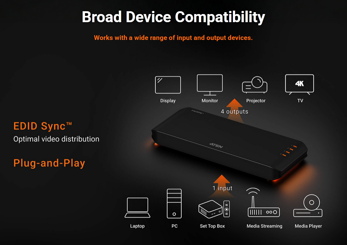 VS4814 to 4-portowy splitter HDMI True 4K, zaprojektowany tak, aby sprostać najwyższym wymaganiom nowoczesnych zastosowań w digital signage i komercyjnych wyświetlaczach. Dzięki funkcji EDID Sync™ umożliwia jednoczesne przesyłanie obrazu do czterech ekranów z jednego źródła HDMI, gwarantując zawsze pełną zgodność z HDMI i HDCP 2.2 oraz doskonałą jakość obrazu. Urządzenie obsługuje HDR10+, formaty 3D oraz Deep Color, oferując bogatszy kontrast i szerszą gamę kolorów, co zapewnia naprawdę immersyjne wrażenia wizualne
